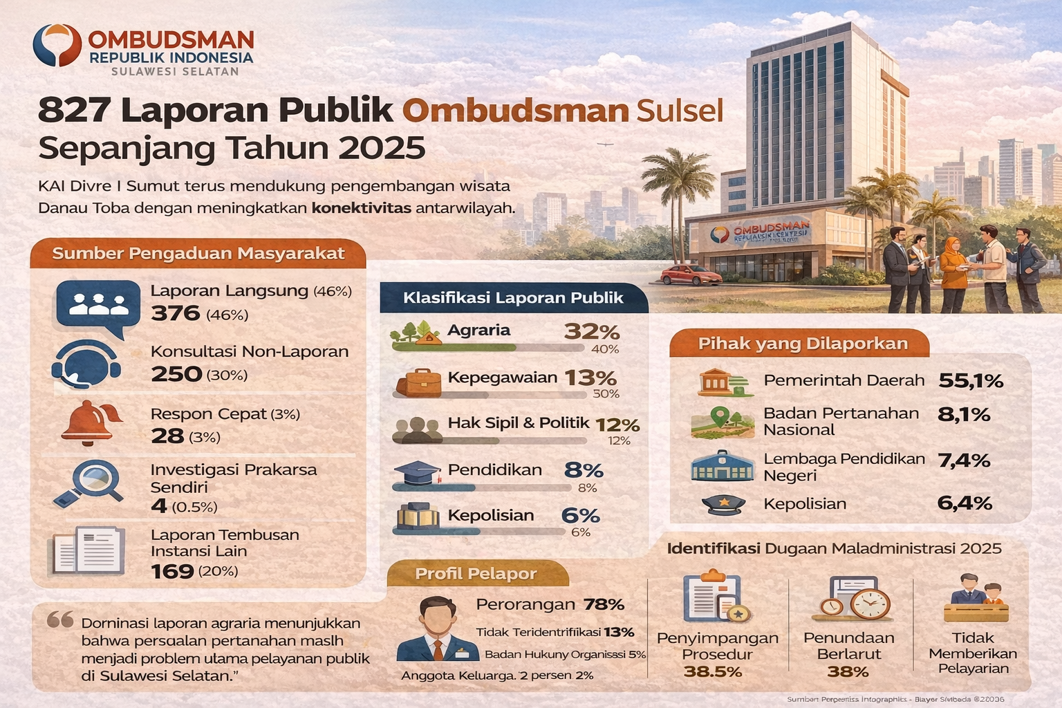 MAKASSAR — Ombudsman Republik Indonesia Perwakilan Sulawesi Selatan menerima 827 akses laporan masyarakat sepanjang tahun 2025. Aduan tersebut berasal dari berbagai kanal, dengan permasalahan pertanahan (agraria) menjadi substansi yang paling banyak dilaporkan.